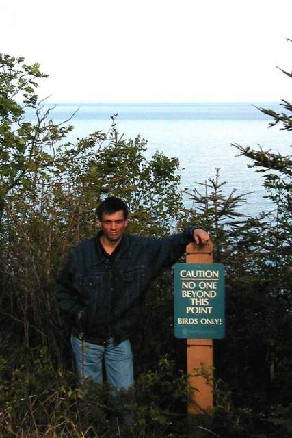 Наверху мы нашли такой вот смешной знак, стоящий на краю 30-метрового обрыва. Дословный перевод: "Внимание! Никого за этим знаком. Только птицы" Чтобы сфотографироваться, мне пришлось перелезть через ограду :)