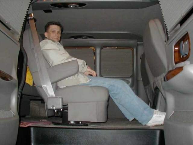 Это я сижу во втором ряду, очень высокая машина. Есть еще 3-й ряд, огромный багажник. У меня в ногах виден телевизор. Стоят такие машины порядка $30000, но б/у вполне можно взять тысяч за 20 3-х летнюю машину.