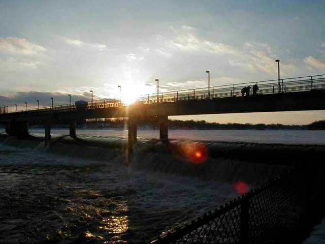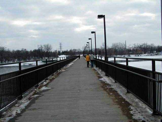 С перил этого моста видна не только река, но и плакаты с различной информацией об окружающей местности. Например на этом написана история этой дамбы.