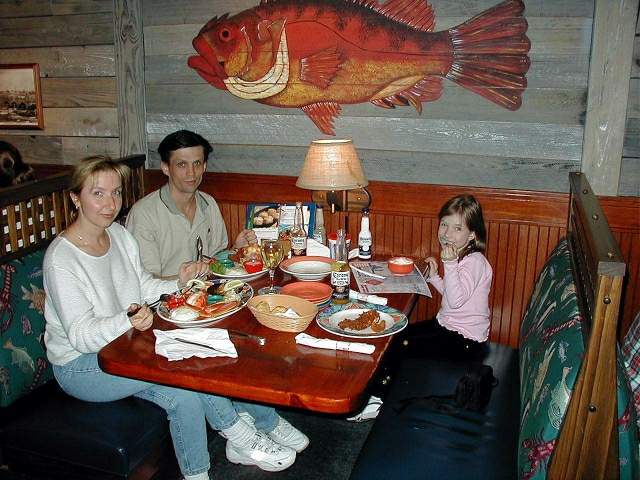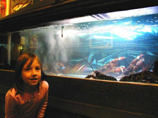 Около входа в зал стоит большой аквариум с живыми лобстерами, которых вылавливают и готовят по мере поступления заказов. Клешни у них связаны - чтобы не повредили друг друга. Впрочем, точно таких же ползающих страшилищ можно найти в любом крупном продуктовом магазине.