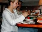 Все блюда здесь принято есть окуная в соевый соус, смешанный с очень острой зеленой горчицей, а между поеданием кусочков суши принято заедать довольно своеобразной на вкус морской водорослью - джинджиреллой. Что интересно, суши из кусочков рыбы с рисом действительно удобнее есть палочками, а не вилкой - кусочки не разваливаются. Народ на фотографии пытается научиться пользоваться палочками, но пока не очень получается :)