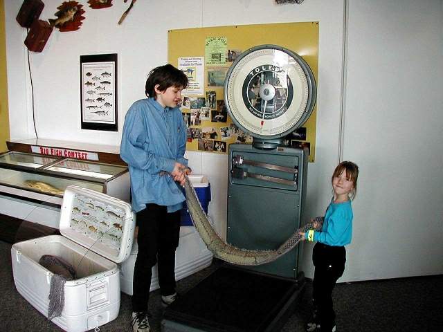 Катя с Антоном пробуют "на вес" муляж рыбы, которая водится в Миссисипи. Кстати, в правилах рыбалки написано, что определенные сорта рыбы нужно выпускать, если они не достигли 18, 24 и даже 36 дюймов, т.е. примерно таких размеров!