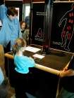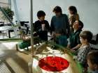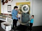 Катя смотрит на количество крови, которое содержится в ее организме - жидкость имитирующая кровь с бульканьем заполняет сосуд в количестве, зависящем от возраста, веса и пола человека, стоящего на специальной платформе.