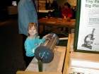Катюшка накачивает воздушную пушку, стреляющую вверх шариками от пинг-понга. Компрессор подает воздух под стол, и шарики висят в струях воздуха, выходящего из отверстий в красном круге. Детям очень нравится.