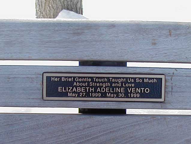 А вот и сама скамья. Ее купила, подарила и поставила здесь семейная пара в память о своем младенце: