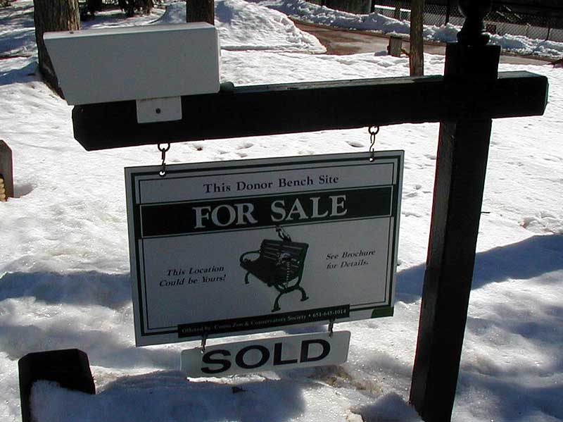 Но есть места и покрупнее. Например, этот знак около скамейки гласит: "Продается место для подарочной скамьи" "Продано"